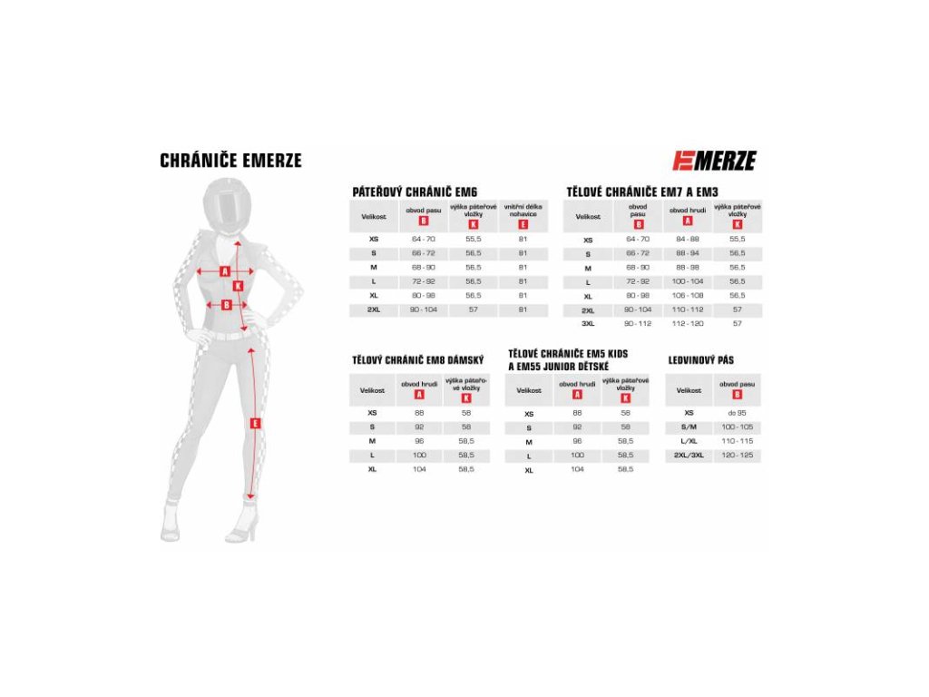 kĺbový chránič chrbtice ventilačné sieťovina na styčnej ploche nastaviteľné ramenné popruhy a bedrový pás upevnenie na suchý zips výber veľkosti: obvod pásu (cm) výška chrbticové vložky (cm) veľkosť XS 64-70 55,5 veľkosť S 66-72 56,5 veľkosť M 68-90 56,5 veľkosť L 72-92 56,5 veľkosť XL 80-98 56,5 veľkosť 2XL 90-104 57