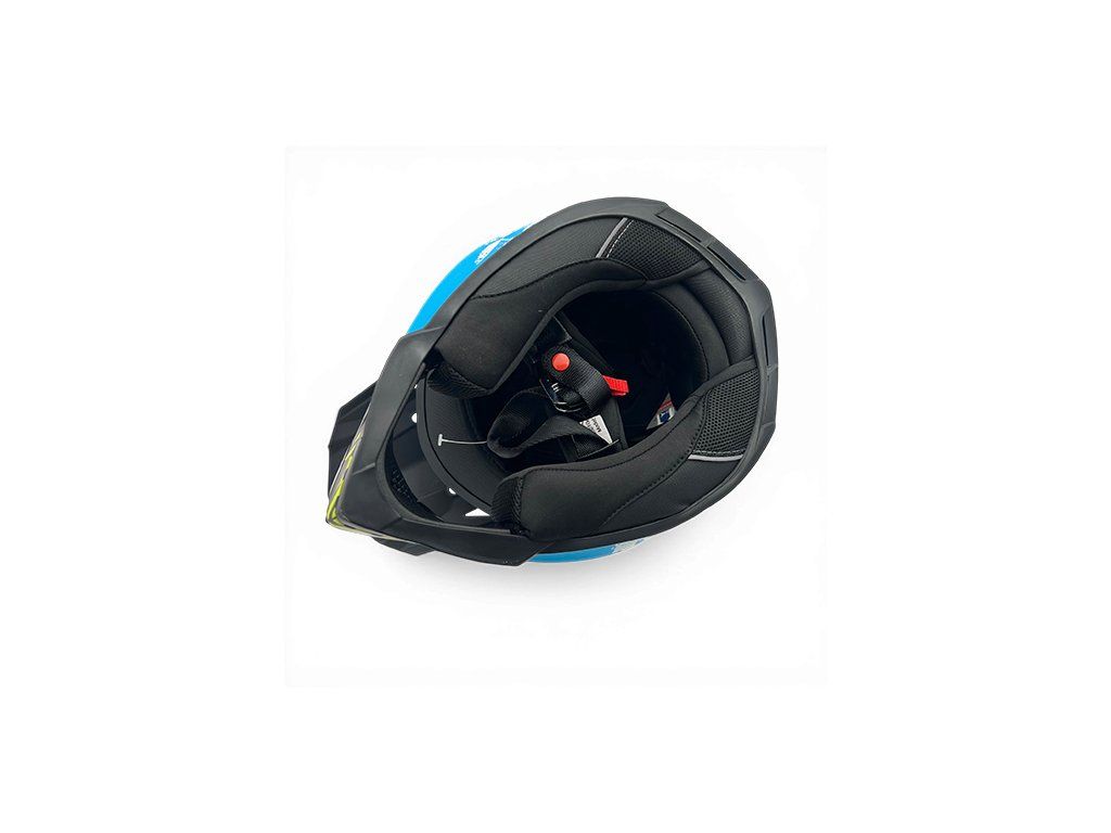 Prilba je vybavená bezpečným podbradovým zapínaním, ktoré drží prilbu pevne na mieste aj pri jazde v teréne. Po zapnutí prilba „nepláva“ a zostáva stabilná.