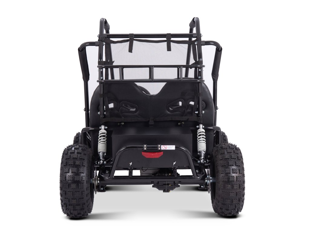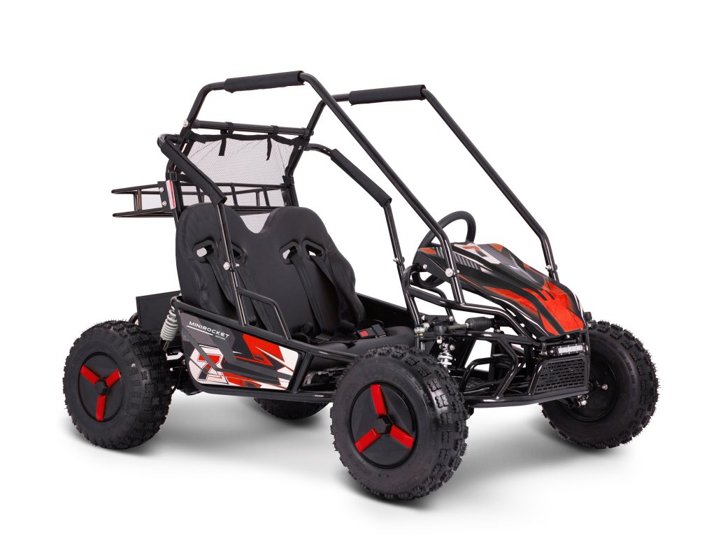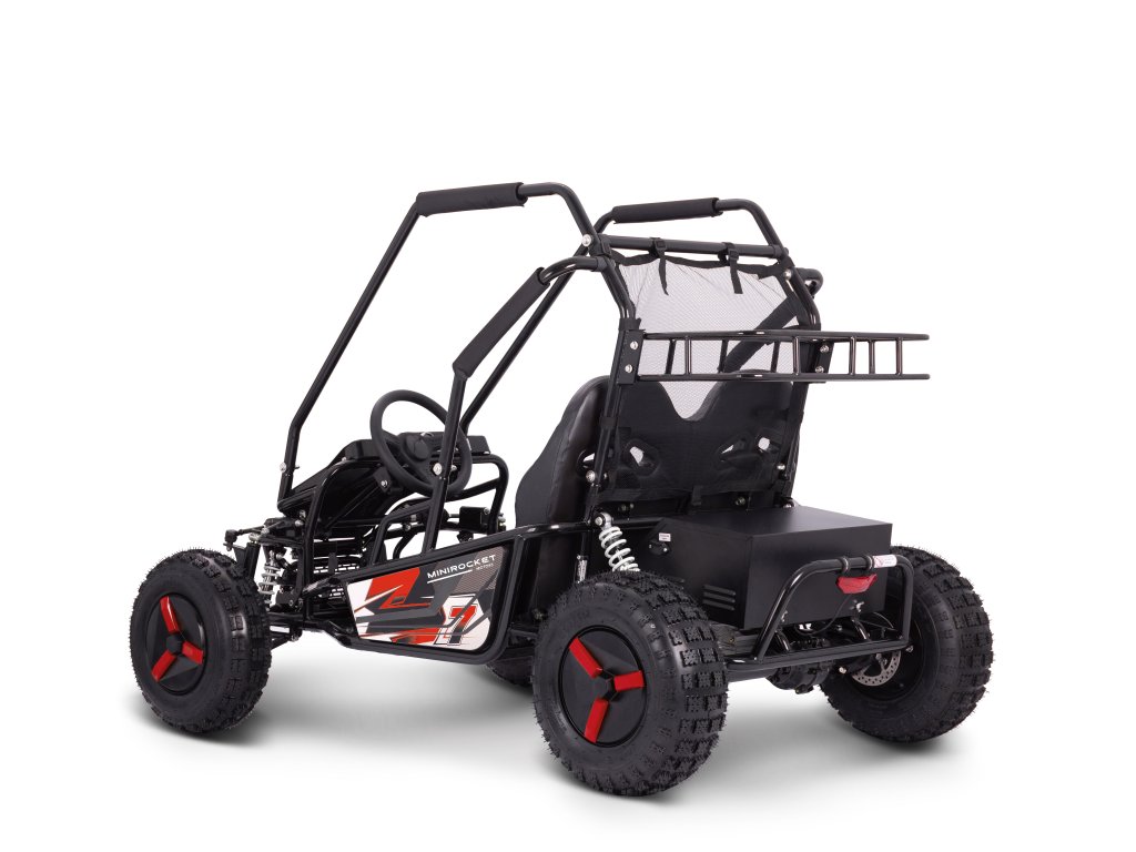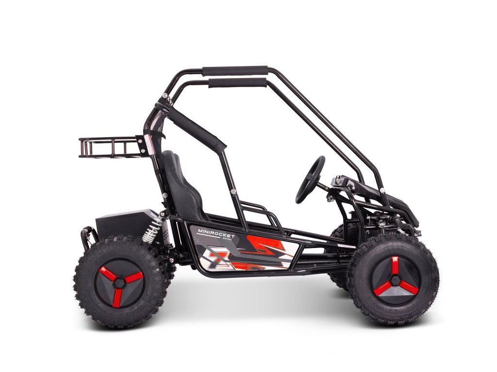 Štýlová, pohodlná, rýchla, odolná – to je elektrická buggy MiniRocket ECOBuggy. Táto buggy je vybavená 2000W motorom, ktorý ju rozbehne na rýchlosť až okolo 40 km/h. Bezpečnosť je zabezpečená ochranným rámom po celom obvode buggy. O brzdenie sa stará dvojica hydraulických bŕzd umiestnených na zadnej náprave. ECOBuggy je taktiež vybavená zadným nosičom na batožinu, ktorý je od kokpitu oddelený bezpečnostnou sieťou. Ovládanie ECOBuggy je veľmi jednoduché – pomocou tlačidiel na prístrojovej doske. Nájdete tam 3 rýchlostné režimy, spiatočku a ukazovateľ stavu batérií. ECOBuggy je ideálnou voľbou pre tých, ktorí si chcú užiť jazdu v teréne, ale nechcú riešiť servis motora, výmenu oleja a iné nepríjemnosti spojené s benzínovými modelmi.